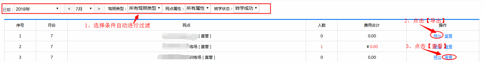 1、选择日期、驾照类型、网点属性、转班状态等条件自动进行过滤搜索数据。如图2.8.1.