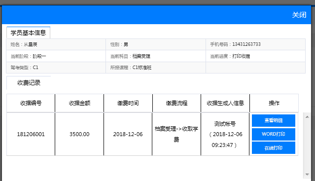 点击收费记录我们可以看到学员的基本收费记录,也可以补打印收费记录,和查看收费明细